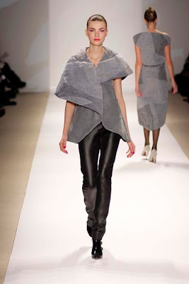 Juhee found inspiration in the work of Louis I. Kahn, an architect of contradiction whose concepts, though modern and elegant, are constructed of basic and often crude materials. Through his influence, she created a sculptured, geometric silhouette and experimented with different construction techniques for her knitwear. She combined fabrics in different directions to make a single garment; used folding and slide techniques; mixed fully fashion, cut and sew, different gage, slippery and dull yarn and elastic and non-elastic yarn to create her unique construction and texture knit fabrics. Juhee was born and raised in Daegu, South Korea. Our picks: Braided trim cardigan and knit grey dress; and another braided vest, metallic yarn dress.