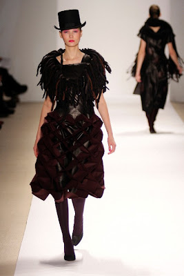 Born in Pittsburgh, PA and raised in Indiana, PA, Felice created a collection inspired by fiber artists, the arts and crafts movement, nature and the environment. Most evident of her inspiration are her felted-wool applications, which look like dreadlocks. She has blended organic wools and leathers resulting in a sculpturally modern silhouette with a Haight-Asbury feel. Scarves by Fashion and Knitwear Design student, Daniel Emir Armosilla, who will present his Spring ’08 collection in September. We like her black leather honeycomb skirt and dreadlock scarf.