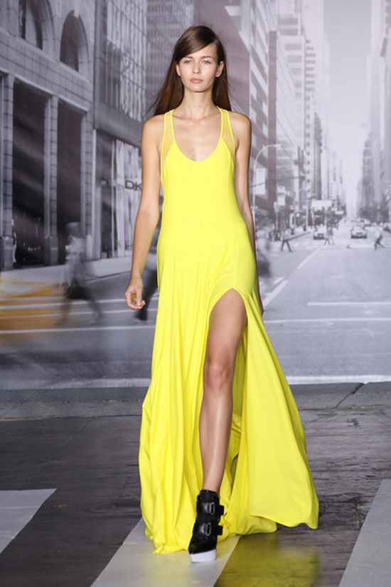 We begin our week long coverage of Mercedes Benz Fashion Week Spring/Summer 2013 with the DKNY show. For Donna Karan, it wasn’t about going with the trends or doing what is “in” fashion. It was about showcasing New York City in all of its beauty for the Spring/Summer 2013 season. “This collection was truly about New York, black, white, a shot of yellow, taxi cab, a real lifestyle of dressing from jeans to t-shirts, evening dresses, long, short, the body, on the go, things you throw on and let’s get going” said the designer to the press. “It is not about “Oh my God, this is fashion this season, it doesn’t go. They are really about the essentials of what one needs in life.” Indeed pairing beautiful long dresses with athletic shoes and belt bags shows Donna Karan is clear about being pragmatic, yet having fun while you at it. Enjoy some images from the collection.